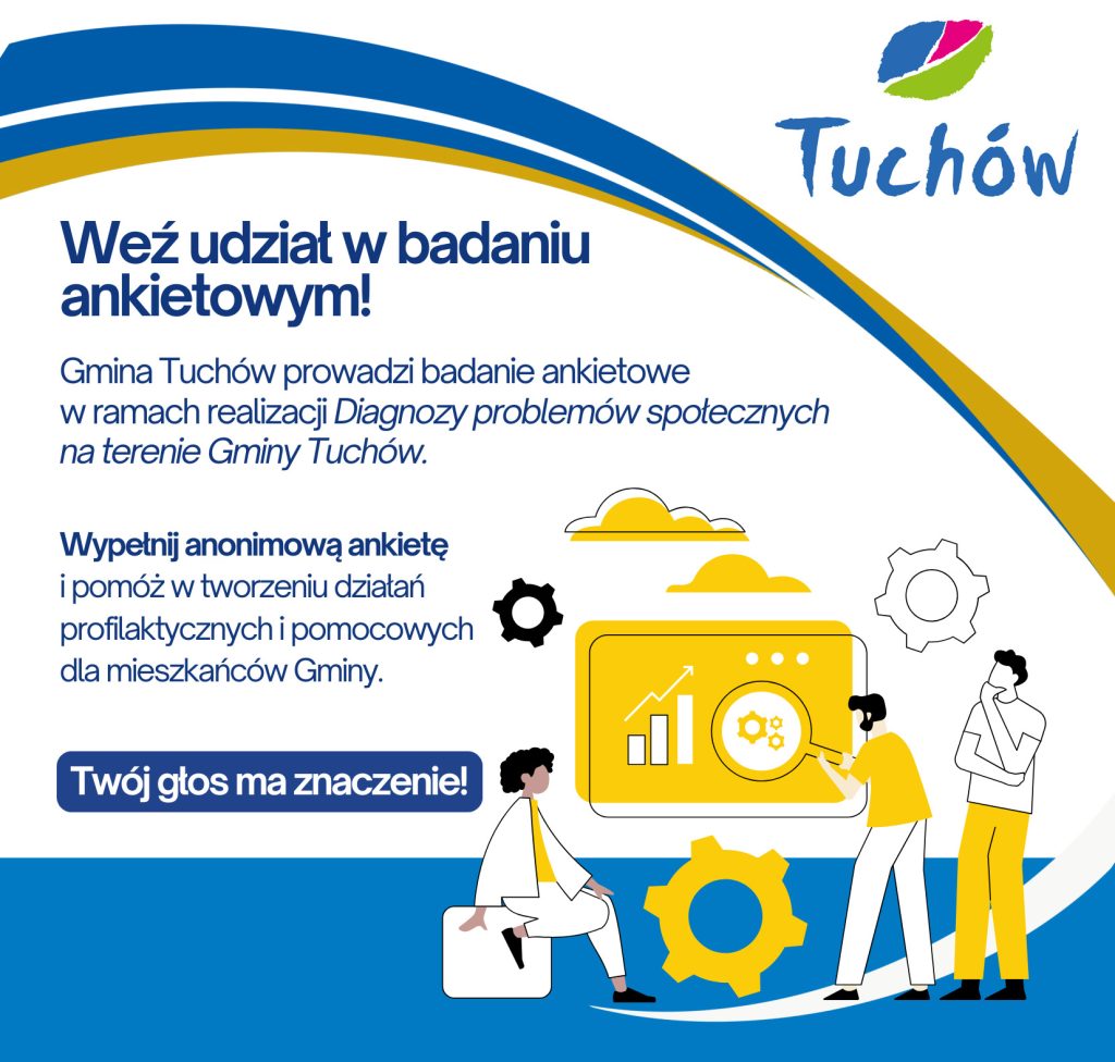 Gmina Tuchów realizuje badanie społeczne na rzecz opracowania Diagnozy problemów społecznych na terenie Gminy Tuchów. W związku z tym, prosimy o wypełnienie anonimowej ankiety – Państwa spostrzeżenia pomogą w przygotowaniu istotnego dokumentu dla naszej Gminy, służącego rozwiązywaniu problemów, z jakimi borykają się mieszkańcy, a także zaplanowaniu odpowiednich działań profilaktycznych.