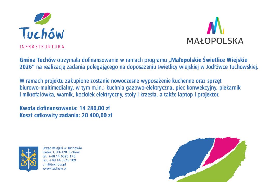 Gmina Tuchów otrzymała dofinansowanie w ramach programu „Małopolskie Świetlice Wiejskie 2026” na realizację zadania polegającego na doposażeniu świetlicy wiejskiej w Jodłówce Tuchowskiej.