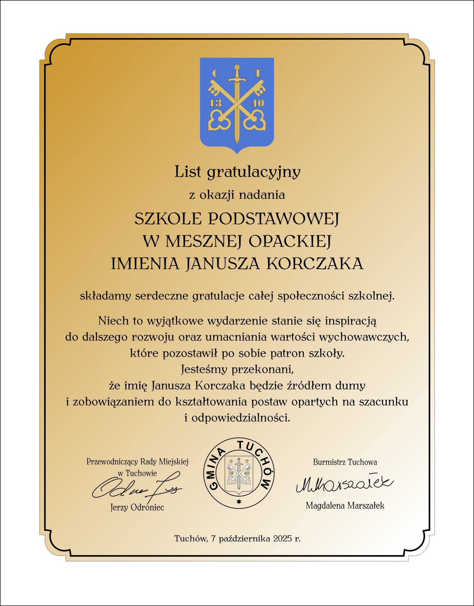 We wtorek, 7 października, odbyła się gminna inauguracja roku szkolnego 2025/2026, połączona z uroczystościami nadania Publicznej Szkole Podstawowej i Przedszkolu w Mesznej Opackiej imienia Janusza Korczaka.