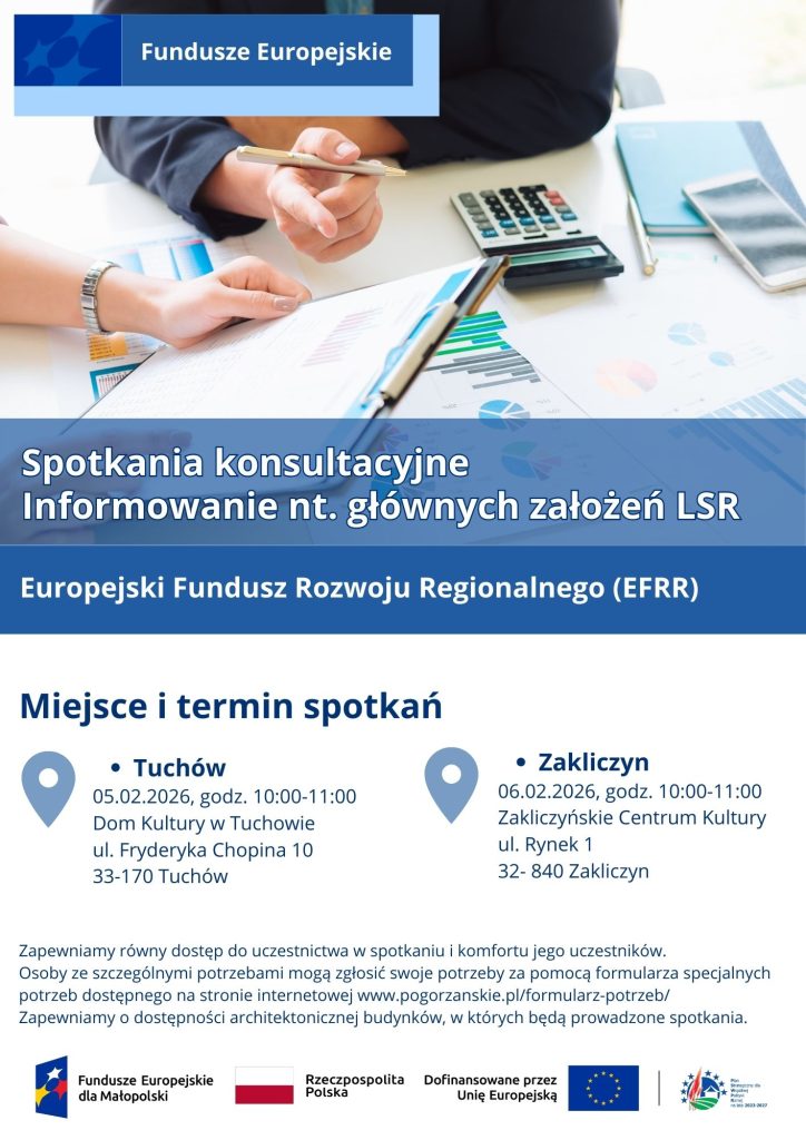 Pogórzańskie Stowarzyszenie Dunajec-Biała zaprasza na otwarte spotkania konsultacyjne prowadzone w ramach działania komunikacyjnego „Informowanie nt. głównych założeń LSR”. Podczas spotkań przedstawione zostaną m.in. główne cele LSR oraz przedsięwzięcia realizowane z Europejskiego Funduszu Rozwoju Regionalnego (EFRR).