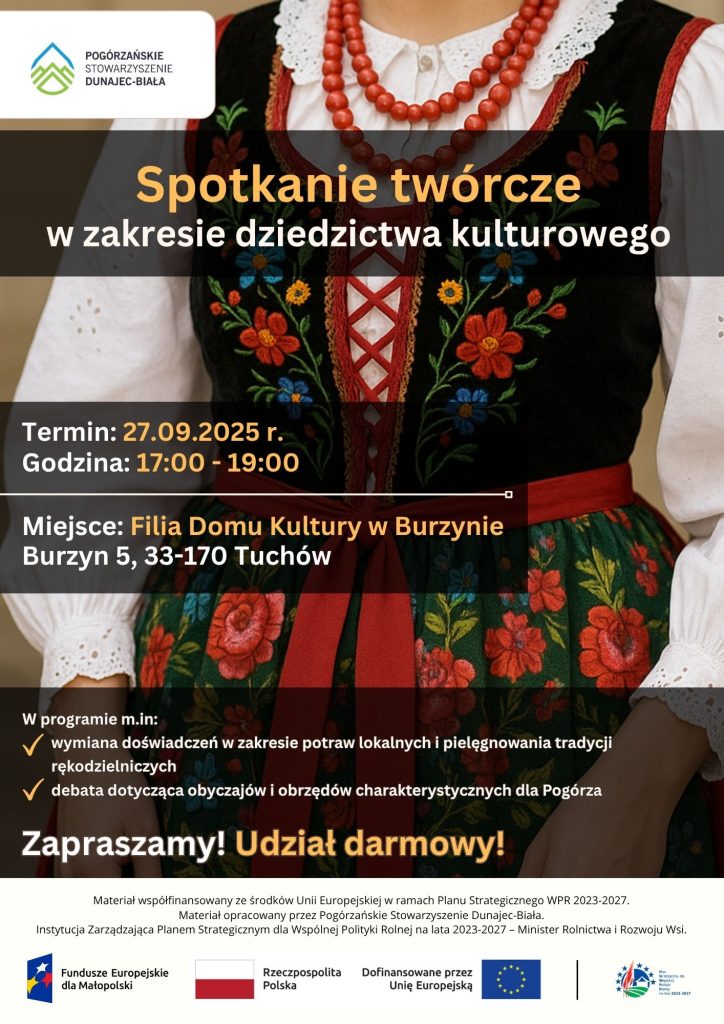 Pogórzańskie Stowarzyszenie Dunajec-Biała zaprasza na wyjątkowe spotkanie twórcze w zakresie dziedzictwa kulturowego. Interesuje Cię dziedzictwo kulturowe Pogórza? Chcesz poznać obyczaje panujące na naszym terenie? Dołącz do nas!